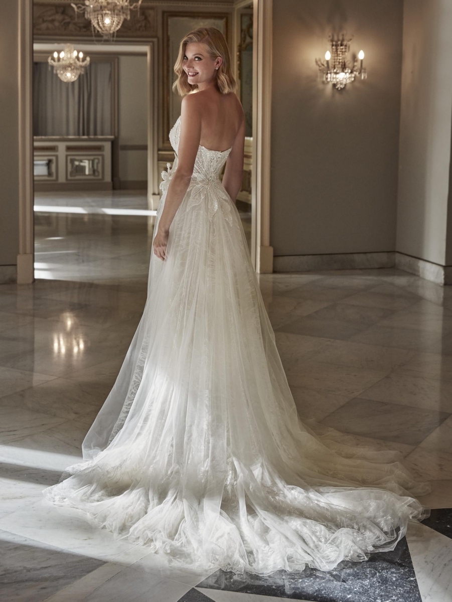 Uno scintillante abito da sposa dalla linea ad A, spacco laterale e un tessuto estremamente luminoso. I dettagli in 3D impreziosiscono ancora di più questo splendido vestito