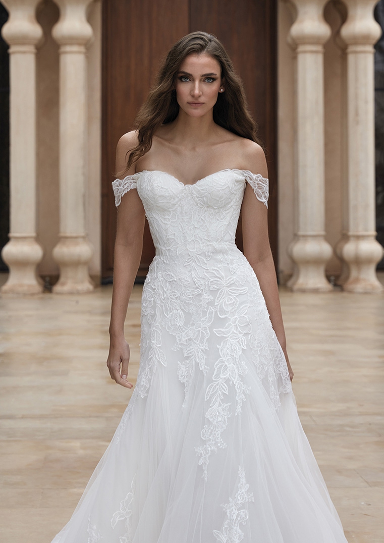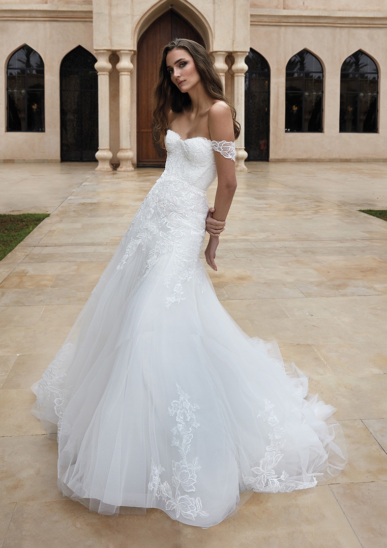 Abito da sposa dalla linea a mezza sirena in tulle ricamato con pizzo floreale. Spalline scese sul braccio e corpino a bustier