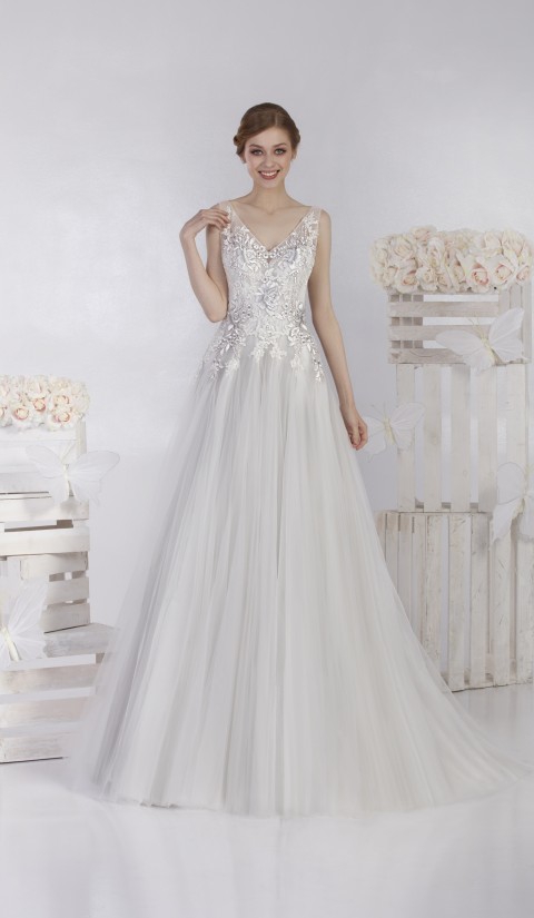 Questo abito da sposa è realizzato in tulle morbido leggerissimo, il corpetto è disegnato da pizzi floreali con filo lucido che dona brillantezza senza bisogno di ricami di perline e strass.